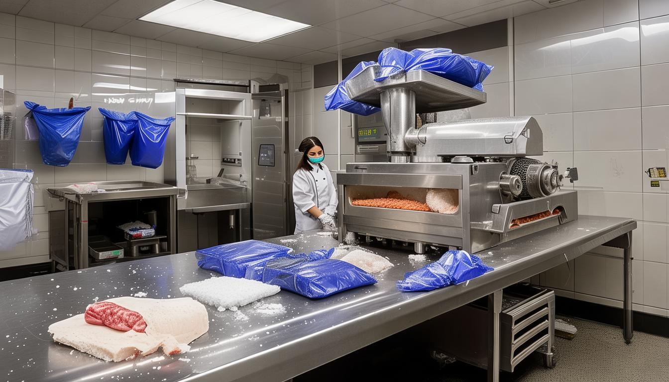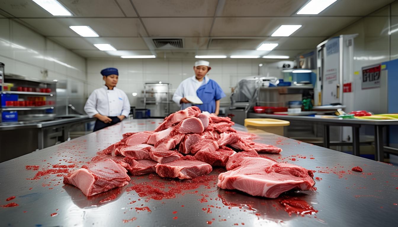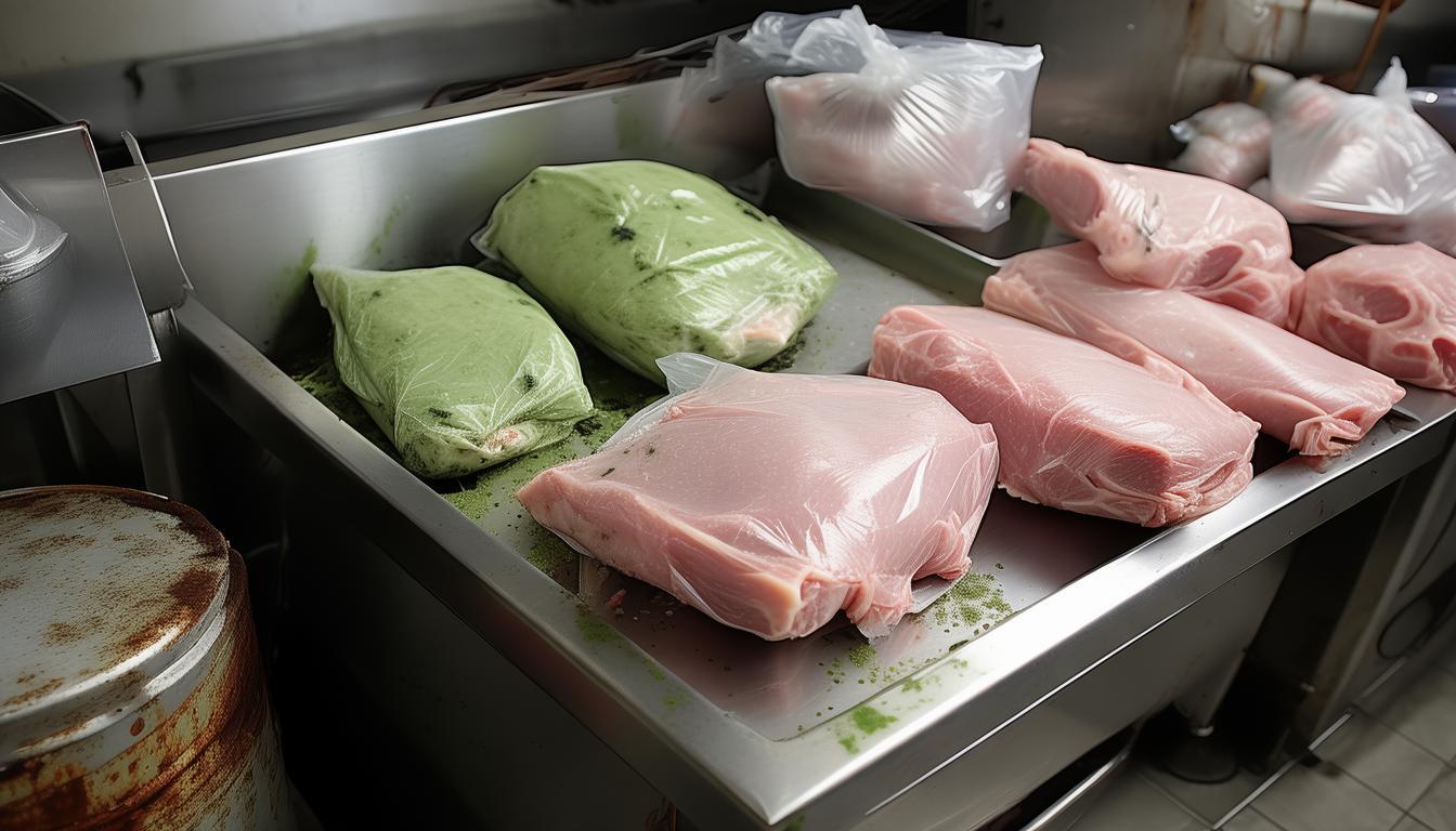 验收完了之后,学校就把这些鲜猪肉交给食堂的从业人员去处理了。他们把鲜猪肉分解成一小块一小块的,其中大部分的鲜猪肉都拿碎肉机绞成了肉沫,然后装到袋子里放进了冰柜冷冻起来;那些带着骨头的肉呢,就分解成小块之后直接装袋放进冰柜冰冻。但是啊,就是这么一通折腾下来的操作,好像并没有能保证猪肉的安全,这储存的方法是不是也有什么不靠谱、不合适的地方呢?这可真是让人心里头七上八下的呢。